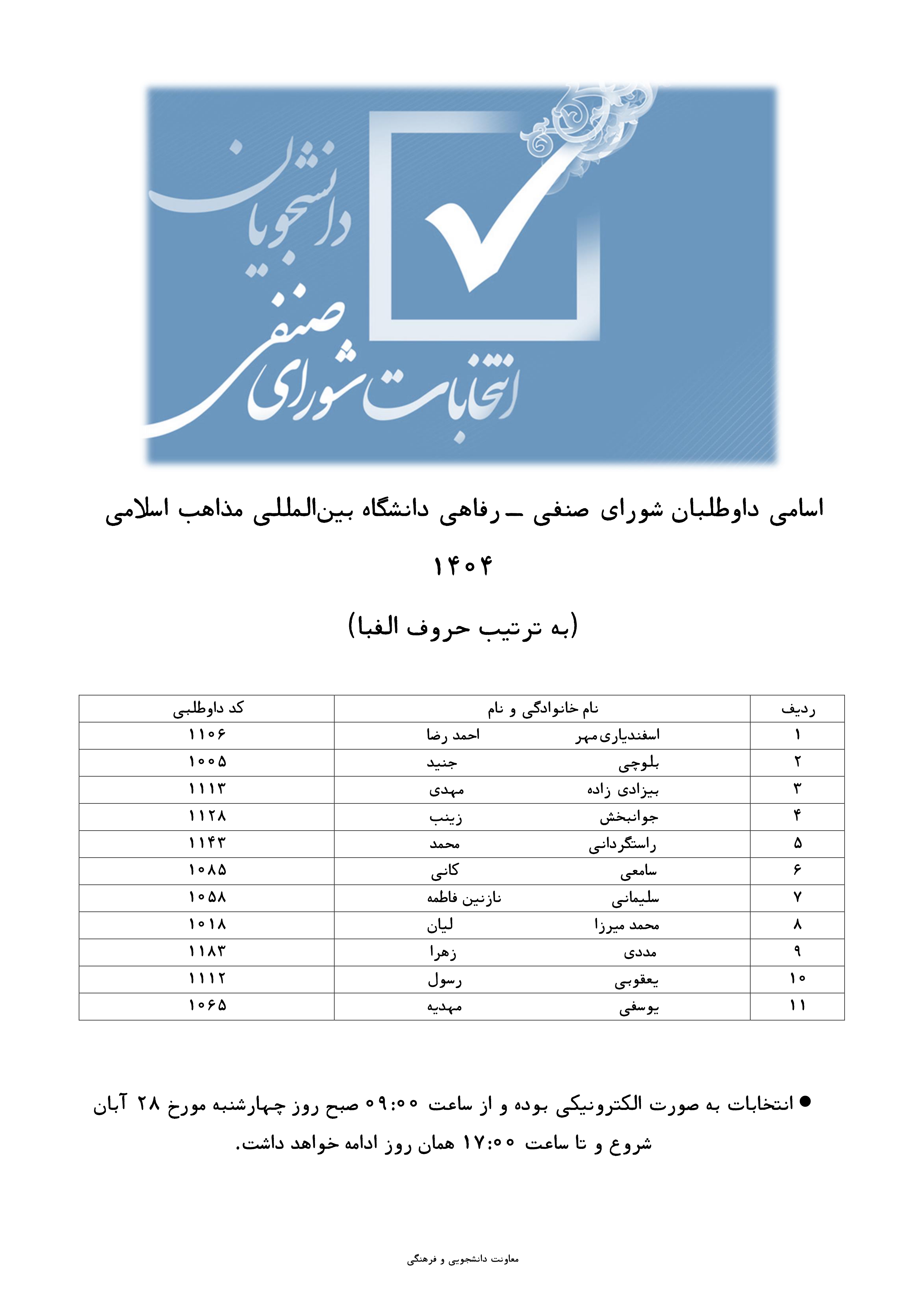 معاونت دانشجویی و فرهنگی دانشگاه بینالمللی مذاهب اسلامی اسامی داوطلبان شورای صنفی ـ رفاهی را منتشر کرد.